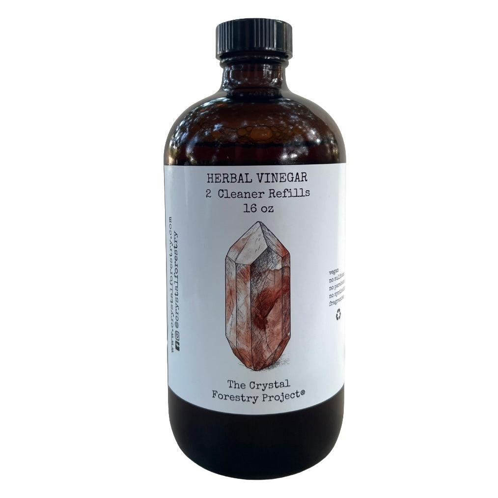 Herbal Vinegar Cleaner Concentrate One 16oz bottle contains 2-8oz cleaner refills for use in 16oz spray bottle, sold seperately. Directions: Mix 8oz herbal vinegar concentrate with 8oz water in 16oz reusable spray bottle. If you have hard water use distilled water. Shake before each use. Spot test before use. Do not use on granite, natural stone, wood, varnished surfaces or metal. For use on mirrors, glass, toilets, sinks, tubs, porcelain, vinyl and laminate floors. Spray on surface and wipe clean with a lint free cloth. Caution: Keep out of reach of children and pets. Do not swallow. If swallowed drink plenty of water. Avoid eye contact. If eye contact occurs flush with plenty of water. Ingredients may cause allergic reaction. Please handle with care and discontinue use if irritation occurs. Seek medical attention if irritation persists. Ingredients: